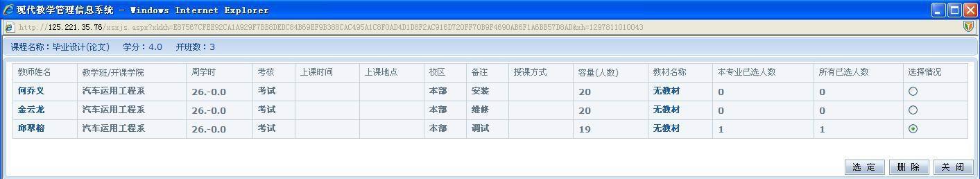 第三步:学生在‘当前位置---学生选课’栏下,课程名称下点击‘毕业设计(论文)’,备注中显示课程方向,学生根据老师要求进行选择,完毕后点击‘关闭’如下图