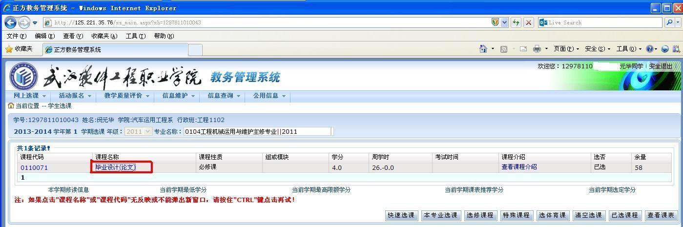 完成以上操作步骤,学生的毕业设计(论文)选课完毕。