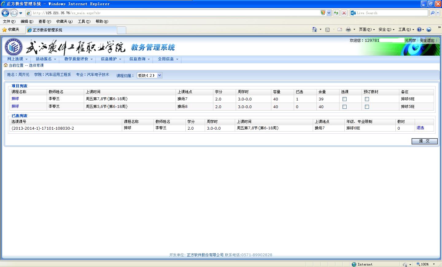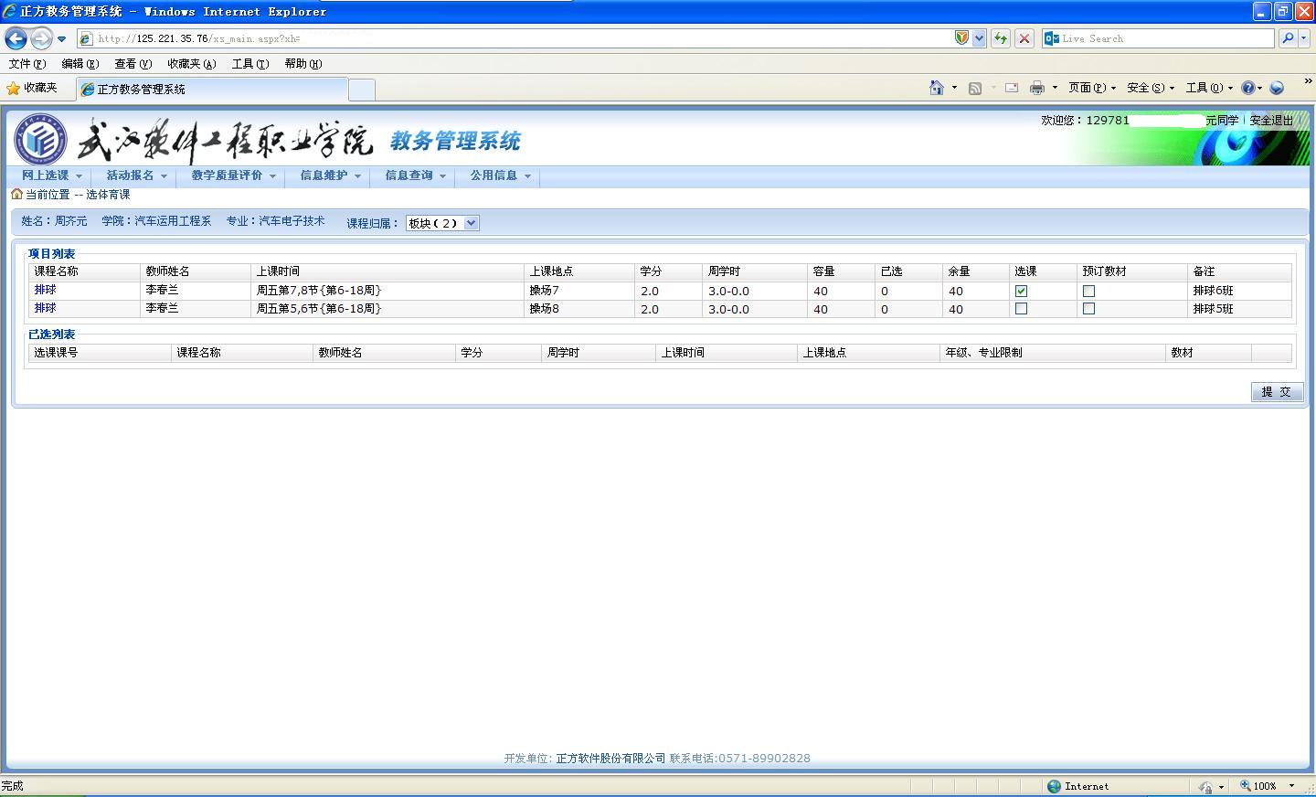 第三步:学生在‘当前位置---选体育课’栏下的‘项目列表’中,选择自己想修的体育项目,在‘备注’中看清班后,并在‘选课’方框中点鼠标正键打上勾,再点‘提交’按钮。‘预定教材’方框中不用打上勾。如下图